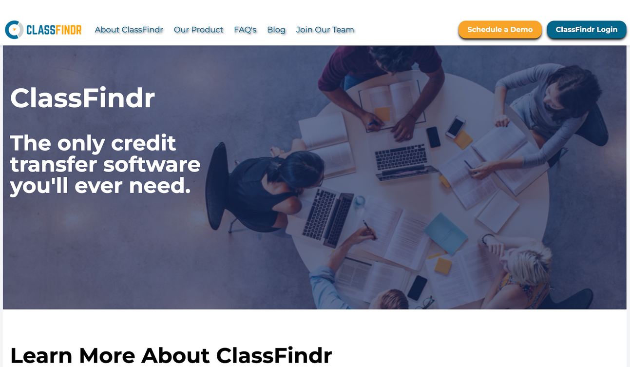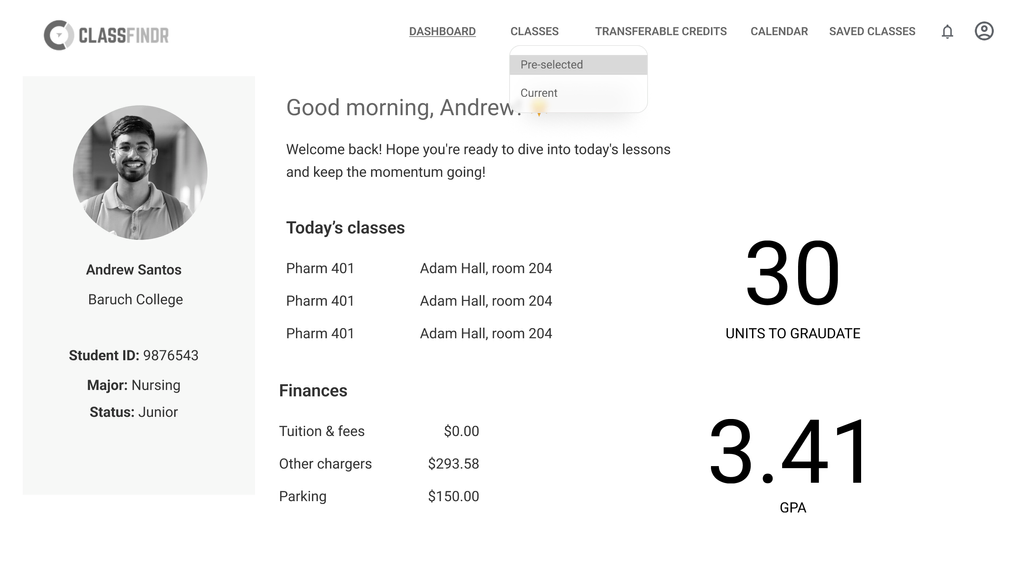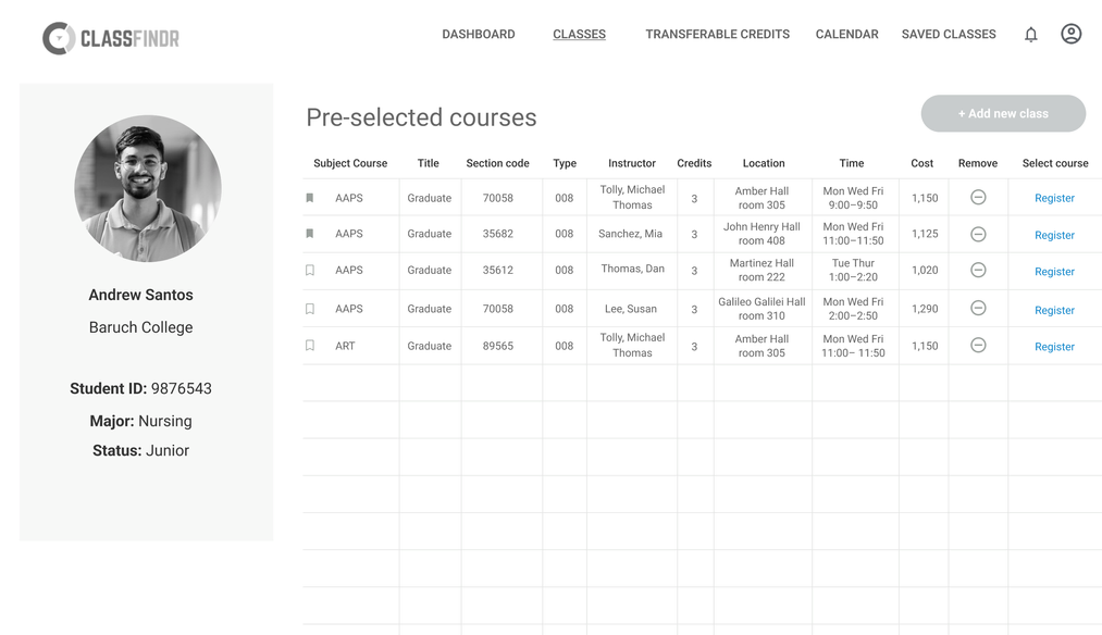 Through extensive research on ClassFinder, we identified that the platform targets both university administrators and college students. We aimed to streamline the credit transfer process, making college registration easier for students.