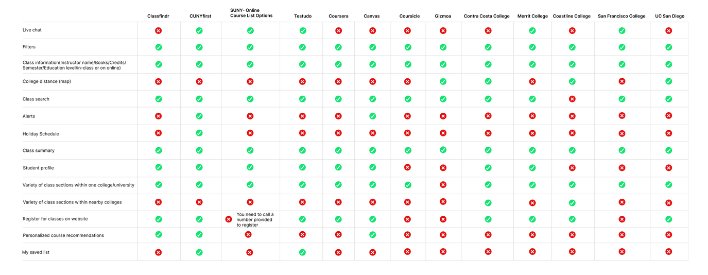 Conducting a competitive analysis highlighted gaps in ClassFinder’s offerings compared to similar platforms. We found the following missing features: