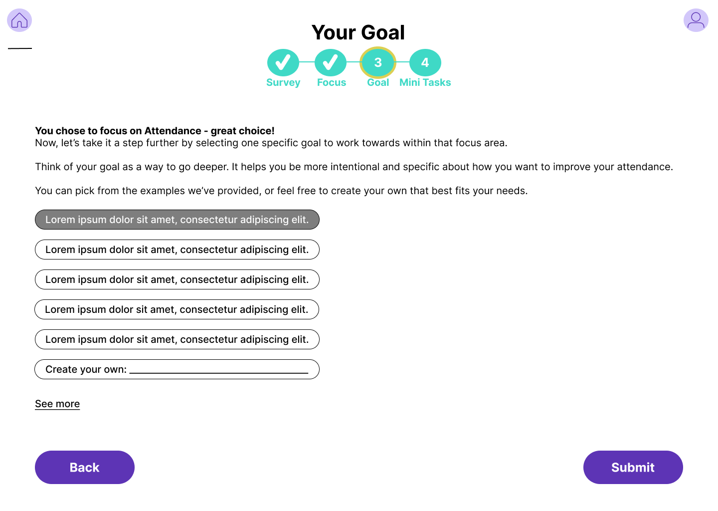 The onboarding flow was designed to guide students step by step into a personalized and engaging experience. After clicking the “Non-Academics” button on the Achieve homepage, they are welcomed with a clear overview of the four-step process and time estimate. From there, students complete an 8-question survey that tailors their account to their needs, then select a Tier 1 focus area to work on for the week. They choose a specific goal, either from suggestions or their own creation, and break it down into at least three mini tasks, with the option to set recurring actions. Once confirmed, students land on their homepage, where their full weekly plan is displayed alongside tools like check-ins, journaling, and a progress tracker. At the heart of the design is a motivational visual: a seed that grows into a tree as tasks are completed, eventually forming a forest that represents progress and growth throughout the semester.