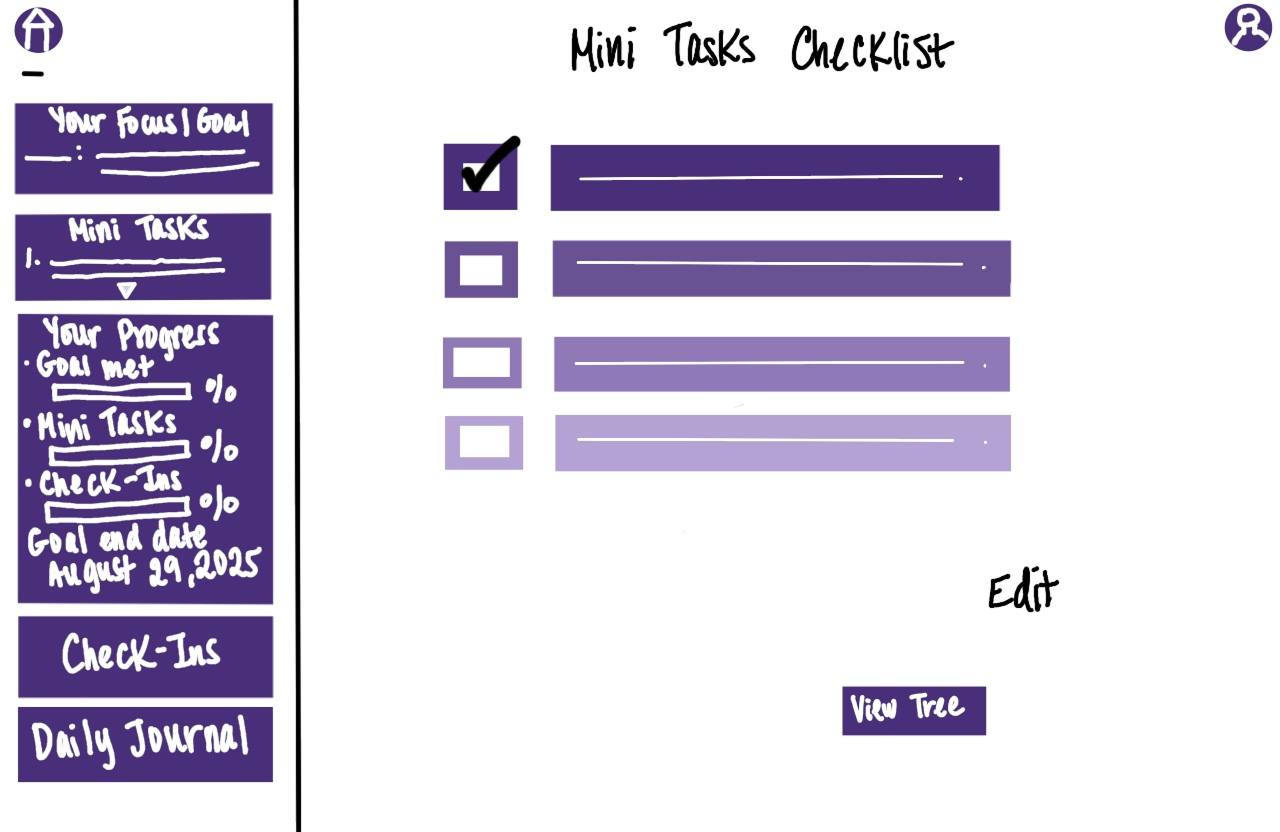 The mini task completion flow guides students from their homepage to a checklist of weekly tasks, where each completed task prompts reflection and a visual update of their progress. As tasks are checked off, the student’s progress bar advances and their tree grows, providing a satisfying, tangible representation of achievement that keeps them motivated throughout the week.
