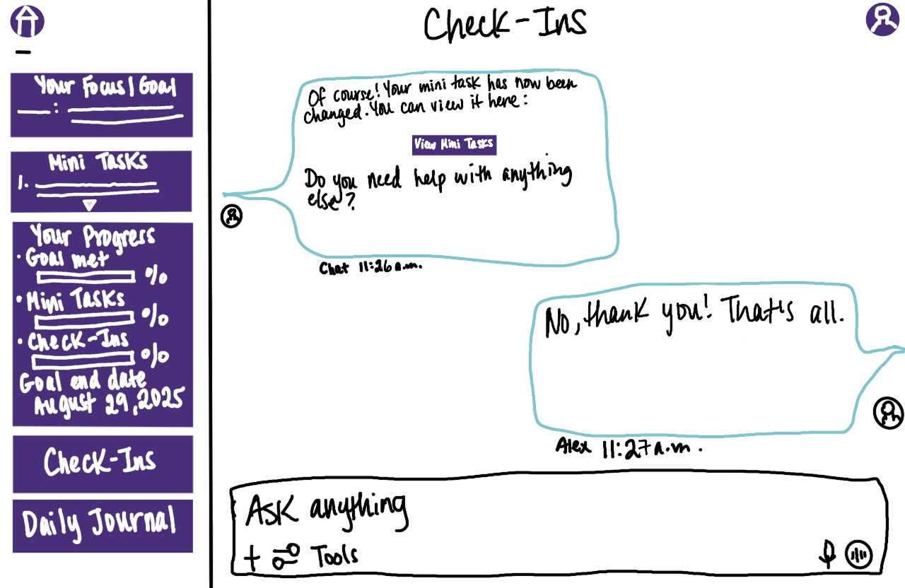 The weekly check-in flow uses a guided chat to help students reflect, adjust, and update their mini tasks, creating a personalized sense of progress. From viewing their tree and focus area stickers to selecting and updating specific tasks, students can see their changes reflected instantly on the homepage through updated sidebars and filled-in stickers. This process reinforces growth with a motivating feedback loop: reflect, adjust, and visually see progress.