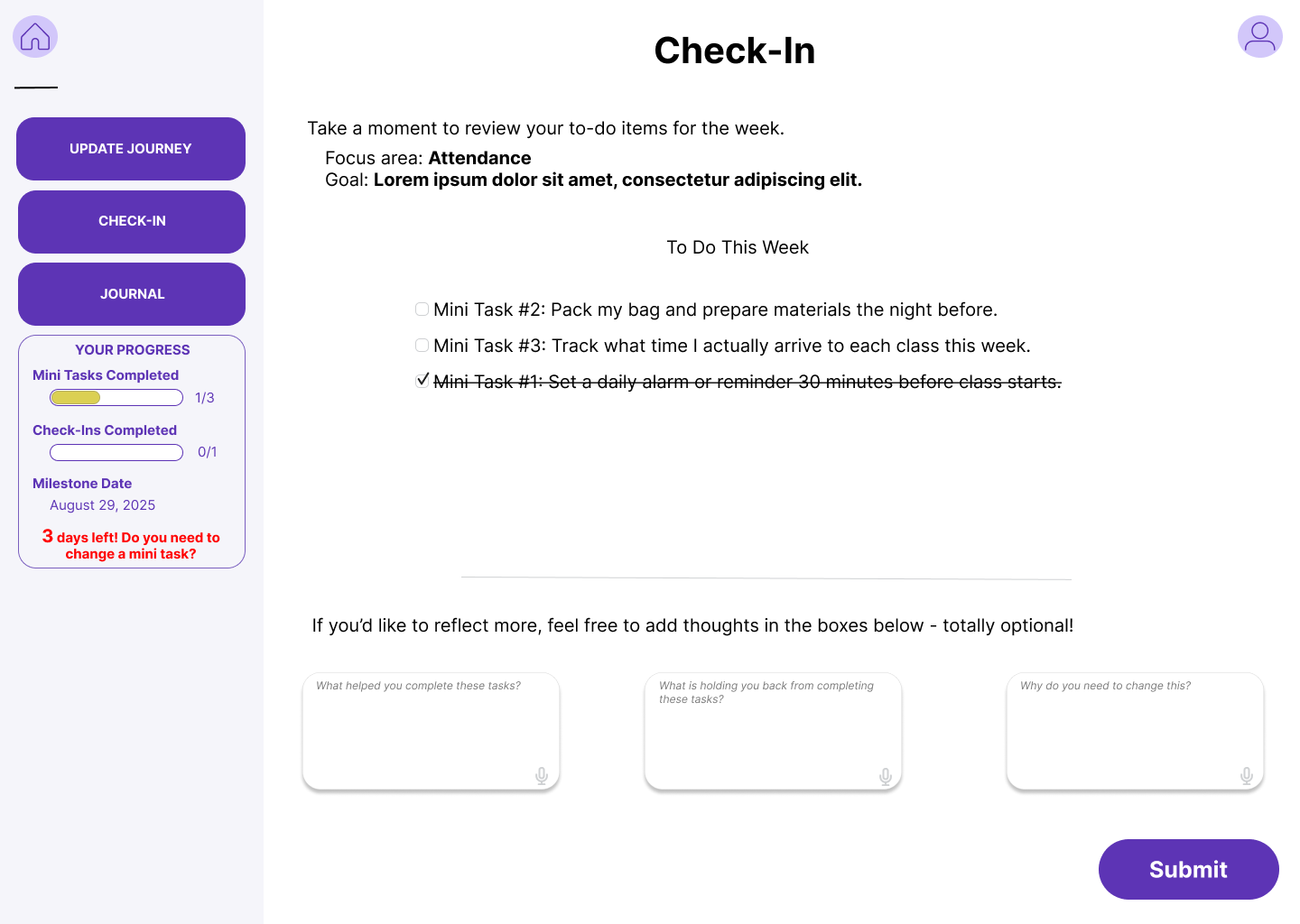 The weekly check-in was redesigned into a checklist format, and flexibility was added for updating milestone dates, creating a more supportive, stress-free experience.