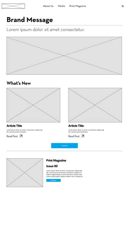 Homepage: Streamlined navigation, a clear brand message, featured work, and print magazine promotion.